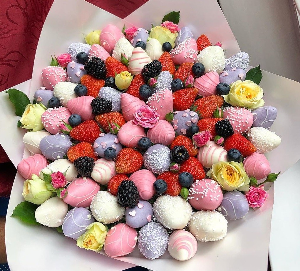Заказала на день рождения подруги и не пожалела. Свежайшие ягоды, идеальное сочетание клубники в шоколаде с голубикой и ежевикой. Розы добавили особый шарм. Размер просто впечатляет. Подруга была в восторге, спасибо!